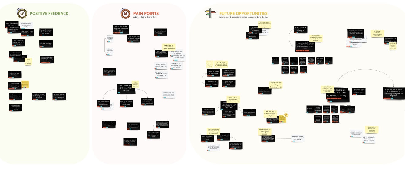 While checkboxes were an easy solution for developers, when it came to bulk selecting, there needed to be clear grouping of what requests were about to be pushed forward in their workflow and depending on certain statuses, secondary options needed to be considered (such as sending items to a print queue or “pre-fill” some of the request details).
